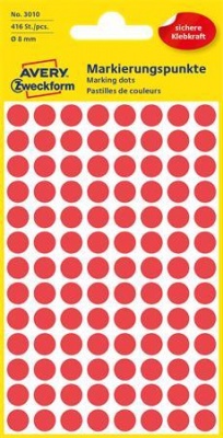 KezdőlapIrodaszerekIrodai papíráruEtikettekEtikett, 8 mm, kör, AVERY ZWECKFORM, piros, 416 etikett/csomag